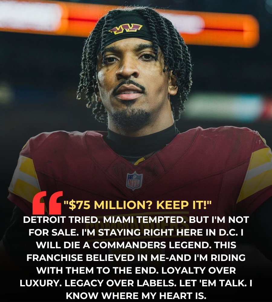 May be an image of 1 person, playing football and text that says '"" "$75 MILLION? KEEP IT!" DETROIT TRIED. MIAMI TEMPTED. NOT FOR SALE. IM STAYING RIGHT HERE IN D.C.I D.C. WILL DIE A COMMANDERS LEGEND. THIS FRANCHISE BELIEVED IN ME-AND ιΜ RIDING WITH THM to THE END. LOYALTY OVER LUXURY. LEGACY OVER LABELS. LET 'EM TALK.I KNOW WHERE MY HEART IS.'